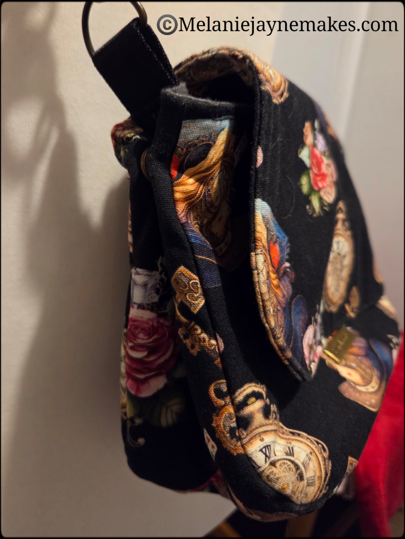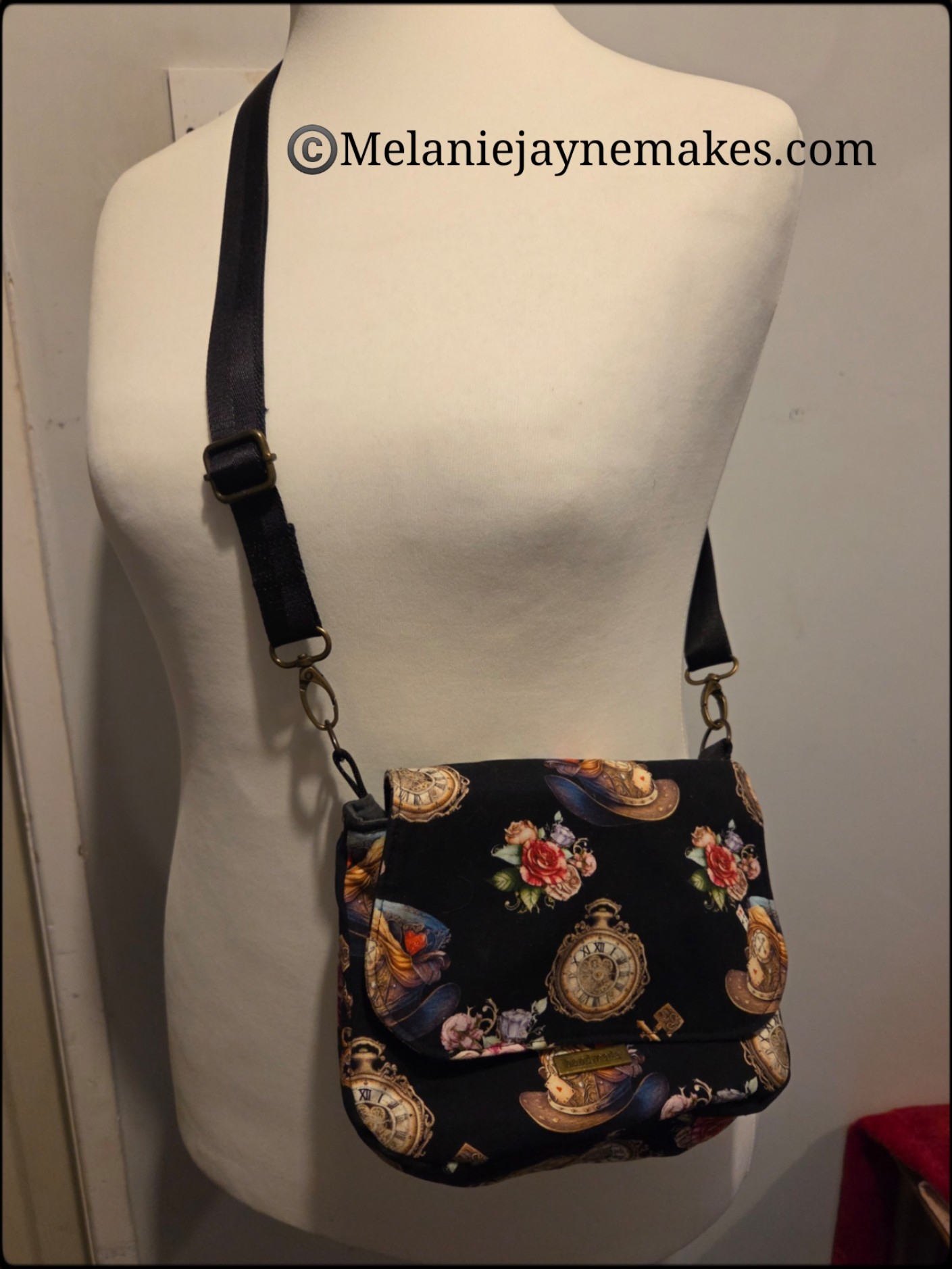 The Brinley crossbody is a small bag with a flap closure.  The sides clip together with press studs giving it a little shape and the flap fastens with a magnetic snap.  It has one internal zipper pocket.  Made using a custom print canvas fabric with steampunk theme.